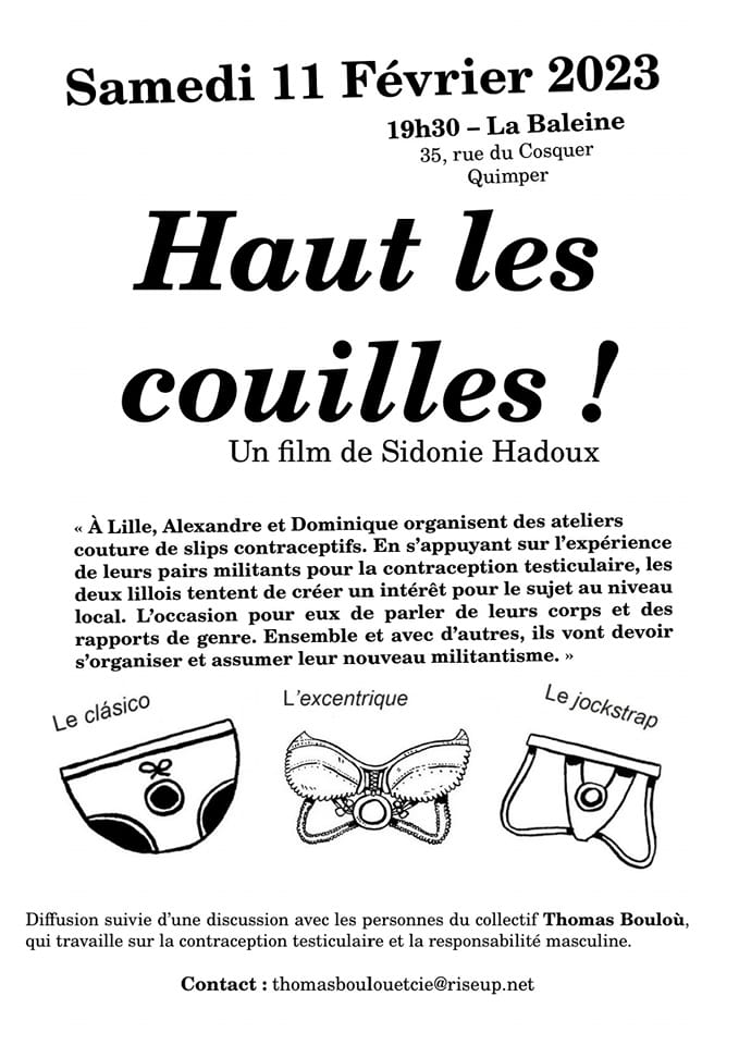 L’association ARDECOM 29 / Le Collectif « Thomas Bouloù » propose une soirée Ciné-Débat : avec le film « Haut les couilles ! » de Sidonie Hadoux (Lille) en présence de garçons « contraceptés » & de militant.e.s pour la Contraception Testiculaire & la Responsabilité Masculine.